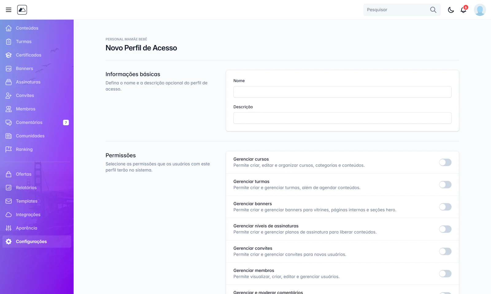 - Nome do perfil (obrigatório) — ex.: “Financeiro”, “Devs”, “Gerente de Comunidade”.