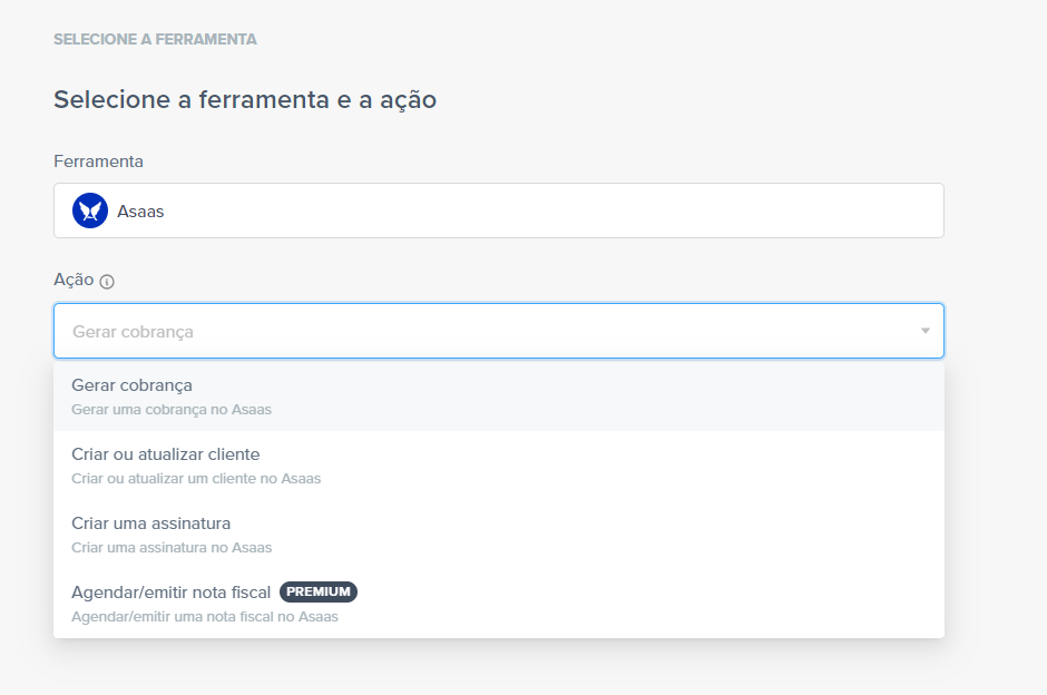 Para isso, clique em “Conectar nova conta”. Em “Ferramenta”, busque pelo “Asaas”; e em “Ação” selecione qual ação deseja ser realizada no Asaas.