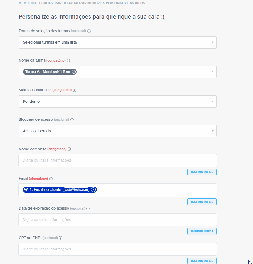 Neste momento, você vai definir quais dados quer enviar do Asaas para a MemberKit. Para isso, é só clicar em “Inserir infos”.