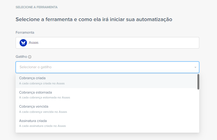 Para isso, clique em “Conectar nova conta”. Em “Ferramenta”, busque pelo “Asaas”; e em “Gatilho” selecione qual ação deseja que dê início à automatização.