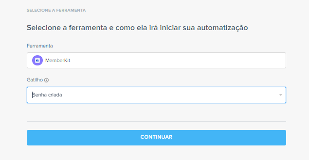 Selecione a ferramenta de origem, o gatilho e clique em “Continuar”: