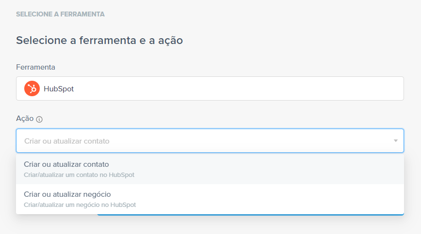 Após clicar em “Conectar nova conta”, em “Ferramenta”, busque pelo “HubSpot”; e em “Ação” selecione qual ação deseja ser realizada no HubSpot.