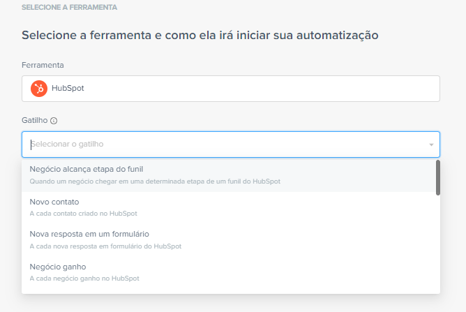 Em “Ferramenta”, busque pelo “HubSpot”; e em “Gatilho” selecione qual ação deseja que dê início à automatização.