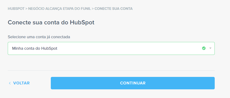 Em seguida, conecte a sua conta do HubSpot. Com tudo certo, é só clicar em “Continuar”.