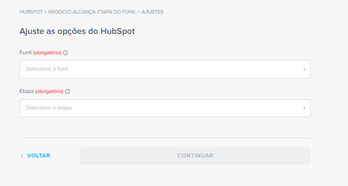 No passo seguinte, você deverá definir qual funil e qual etapa, quando alcançada, deverá iniciar a automatização.
