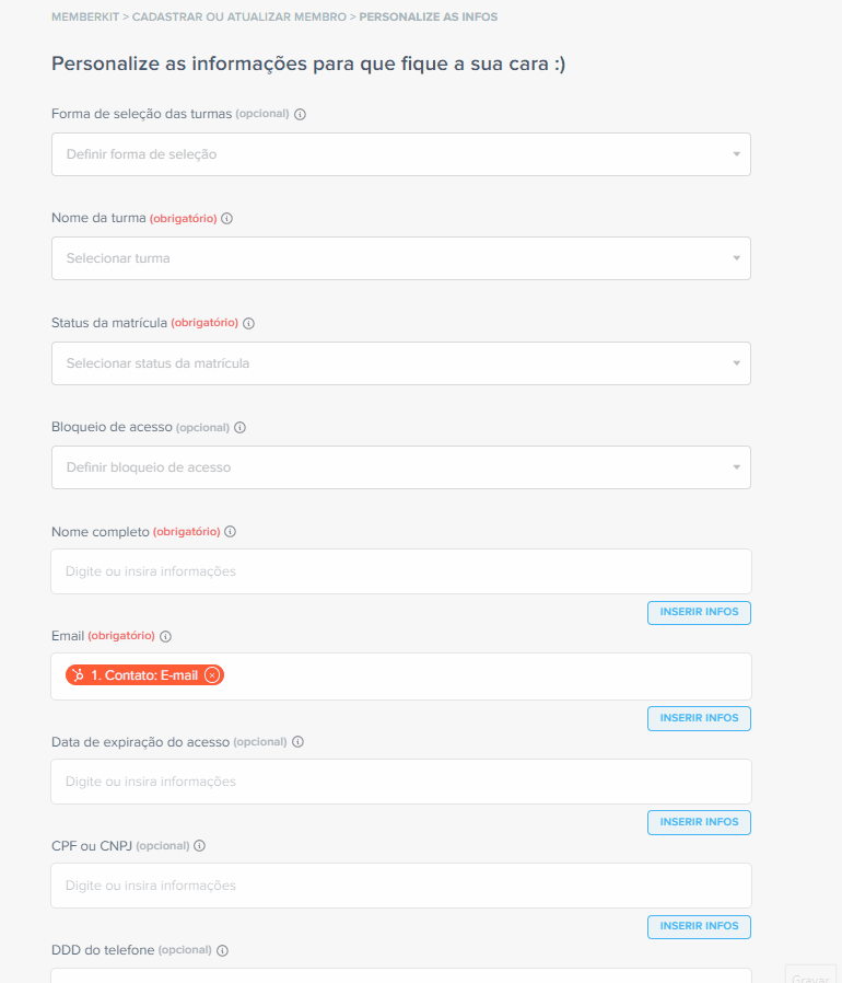 Na etapa seguinte, você vai definir quais dados quer enviar para o HubSpot vindos da MemberKit. Para isso, é só clicar no campo ou em “Inserir infos”. Veja, abaixo, um exemplo: