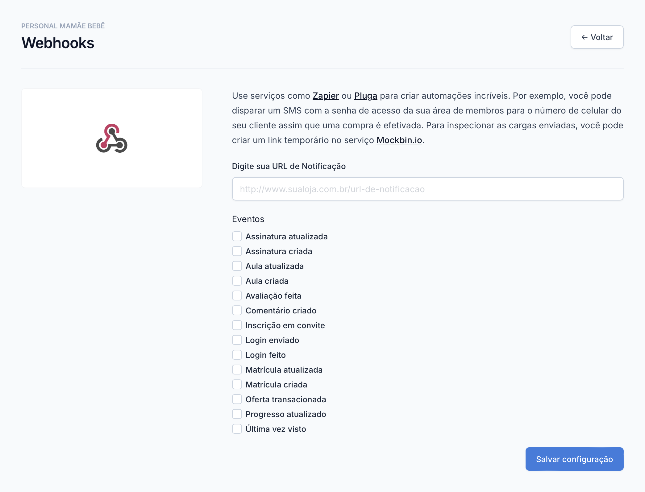 Integrações›Disponíveis›Webhookse depois registrar uma URL de callback. Para testes, recomendamos o uso do Mockbin para receber os webhooks. - Pronto! Agora você receberá os eventos selecionados.